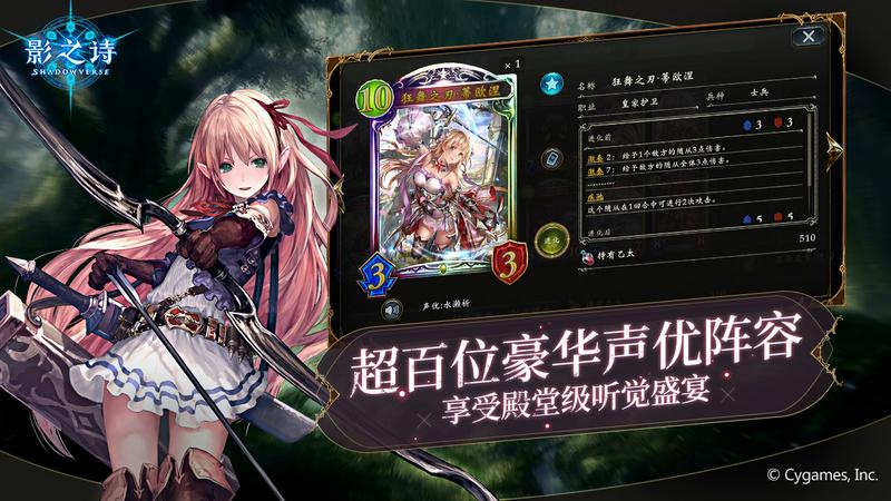 《影之诗》 (Shadowverse)是由日本Cygames公司开发的一款日式幻想题材卡牌对战手游。本游戏拥有丰富的战略、独特的进化系统、强竞技性的玩法、华丽的卡牌立绘、上百位超人气声优及原汁原味的日式幻想故事,让玩家在畅快对战同时,在日式幻想大世界中尽享视觉的饕鬄盛宴。