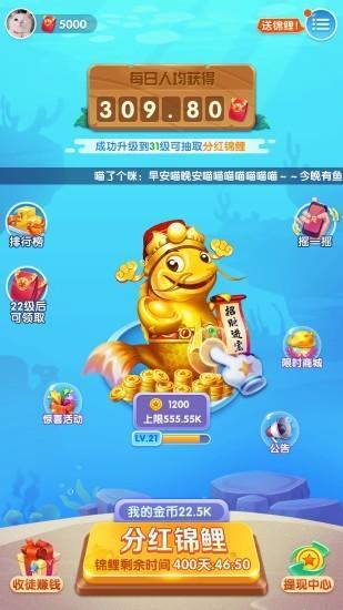 1、锦鲤大亨这款游戏的界面是非常简洁的,各种游戏的内容一览无余,人性化的操作让你轻松完成任务。