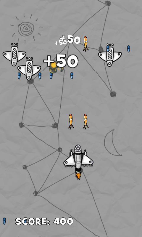 万众期待的涂鸦风格飞机大战游戏来了!在这全民打飞机的时代,“打飞机”能让你尽情的释放压力。享受扫屏的乐趣!!刺激,紧张,玩法简单,想要高分,也要你拿出所有的技术。需要尽你所能去避开所有敌机,然后消灭他们。密集的弹幕会放你发狂,看看作为战机高手的你,能坚持几秒?还是1分钟?2分钟?躲避攻击反击杀伤敌机是你唯一要做的事情。战机会跟着你的手指移动而移动,不用担心手指遮挡飞机。精致的涂鸦风,搭配激昂的背景音乐,将带给您视觉和听觉上的双重刺激。