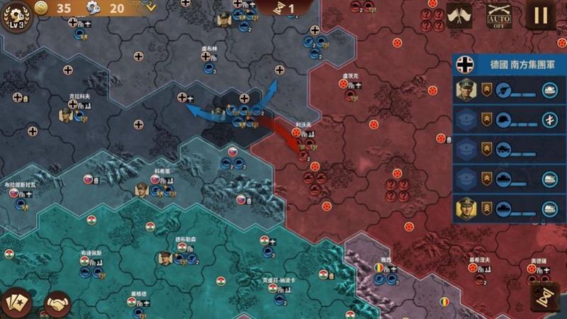 部署集团军部队,每个国家有其专属科技卡牌,通过科技卡牌加速征服世界的进程。