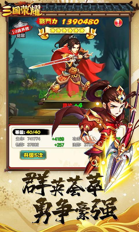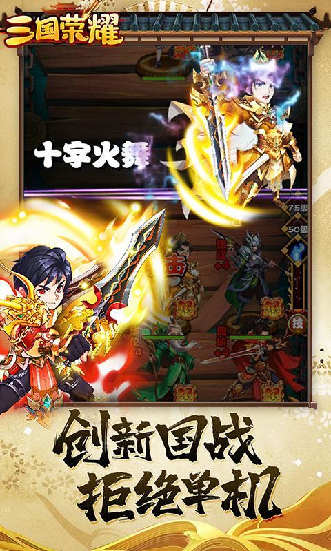 角色扮演 / 2021.03.28 更新《三国荣耀》是一款三国题材的放置类卡牌游戏,游戏中有着独创的【合纵连横】玩法,带领你领略不一样的三国魅力。玩家升到11级即可免费领取到游戏内全部52个五星武将、阵容自由搭配不是梦,每个武将精心设计的技能,让战斗告别单一的碰撞,带来酷炫的视觉体验。游戏还拥有着丰富的养成系统,坐骑、兵法等多种养成玩法,让你的武将随着不断进化成长,助你一统三国。