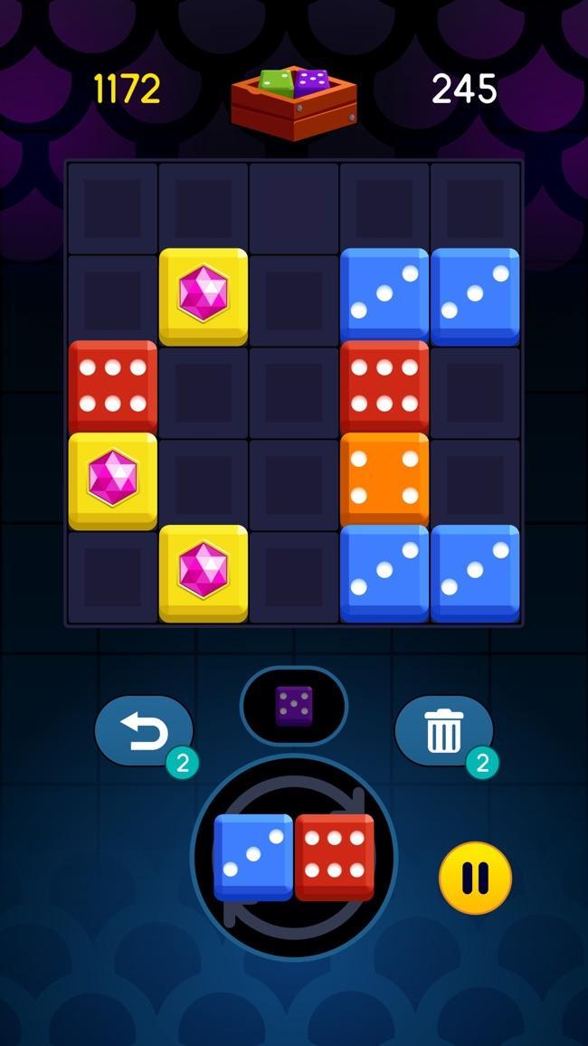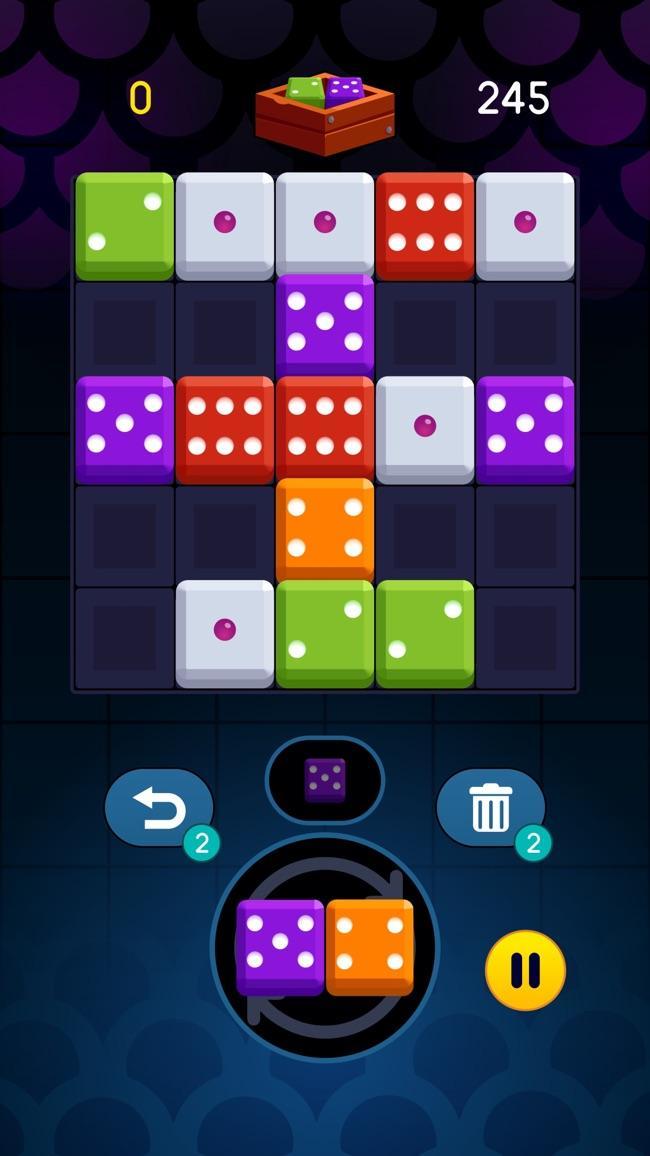 拖动3并将更多相同颜色的骰子水平或垂直放下以爆炸,块在放置在板上之前能旋转。有6种颜色的多米诺骰子可供选择,三个6点骰子合并为一个魔术骰子。如果没有空间随机放置骰子,手游将结束。