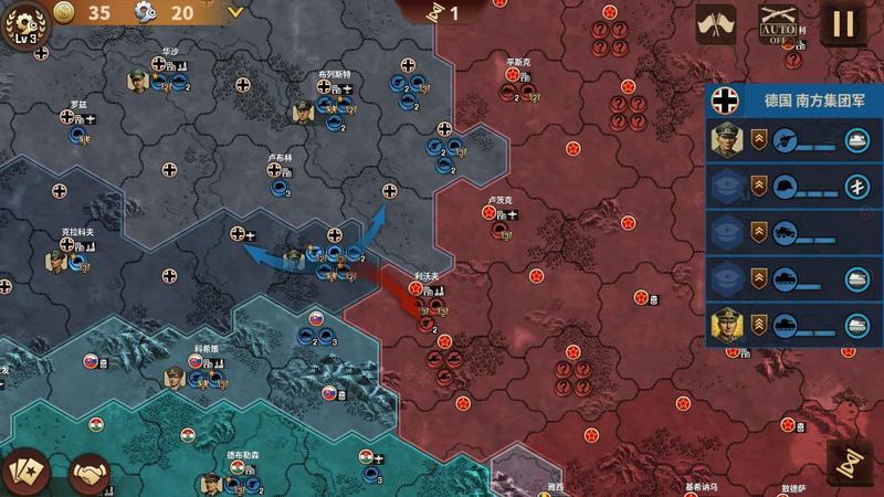 部署集团军部队,每个国家有其专属科技卡牌,通过科技卡牌加速制服世界的进程。