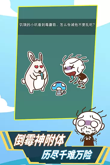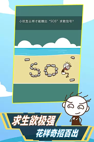史小坑活下去为趣味性的解谜手游,玩家的主需要目标是解救主人公史小坑。 史小坑一展开落难到荒岛上,不要断遇到各种倒霉搞笑的事宜,每一关史小坑都要解决一个生存上的难题,缺水断粮.面临惊险,遭遇野人,需要解决各种问题,才干在岛上生存下去。核心玩法:以问答加操作的形式表现,每个关卡惟独一个过关方式。