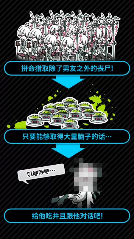 这时玩家能选择外出,把抓到放在庭院中圈养的僵尸杀死后,把僵尸的脑喂给男友吃让他成长。