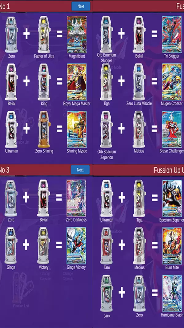 奥特曼变身器手游包括每一种奥特曼的卡。从昭与时代到平成。有很多单卡与组合卡可供2张卡融合使用。