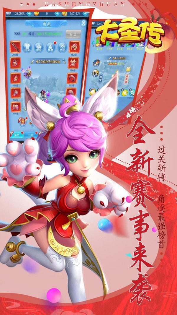 角色扮演 / 2021.05.05 更新大圣传,玩家在手游里能收集各种西游人物进行战斗,培养每一个角色,帮助他们提升战斗力,组建自己的强大队伍,前往副本进行战斗,挑战关卡Boss,掉落超多的装备与金币,去招募更多的大仙,助力成为仙界至尊,掌管三界。