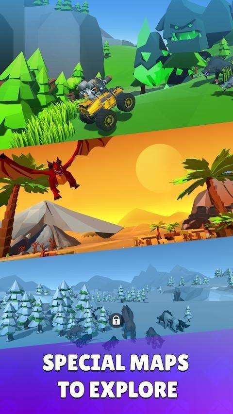 4.战车怪物猎人是一款卡通风格的射击冒险手游。在手游里,玩家需要做的就是操纵自己的战车去到多样化的关卡场景里冒险,击杀一路上看到的每一种对手;这款手游单手即可操作,很合适打发时间,如果你感兴趣的话那就快来体验吧