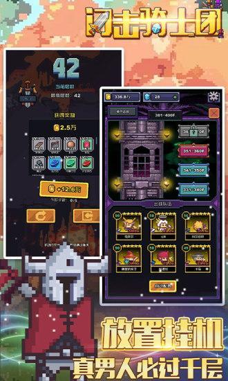 1.闪击骑士团,一款全新上线的像素风回合制冒险战斗游戏。在这中玩家将招揽各个骑士,通过武器.铠甲.饰品等装备升级,职业升星等方式全方位培养你的骑士团,还有九大职业技可以自由搭配,经典的回合战斗玩法任你体验,非常精彩