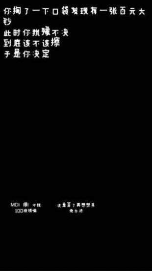 1.非常简约的画风,黑背景与白色文字,字体很好看,整个文字呈现方式也很鲜亮;2.很奇葩的剧情,过程有点重口味哟,情节真的不要需要雷人,你的选择对结果很重需要哟;