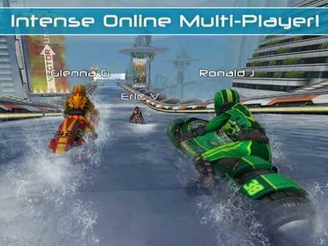 玩家操纵水上摩托艇跳入高台,秀出炫目特技平稳落地。