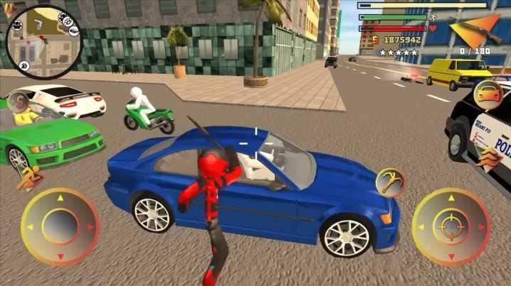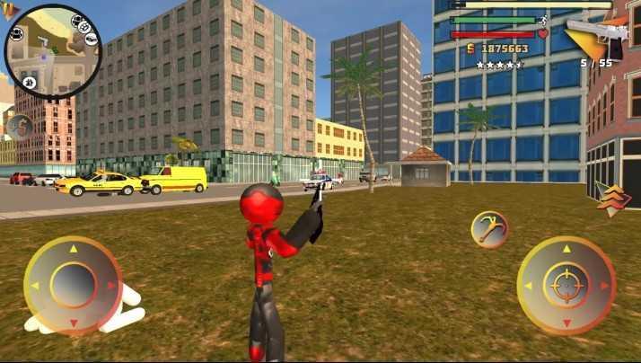 左侧移动、加速,右侧绳索,攻击(跳跃),跳跃,右上侧的武器更换以及血量、经验的显示都实时更新,一览无遗,凭借着大家自由的玩法,与其他帮派的人物进行交火,期间杀人能够获得经验,杀多了会产生星级,警察和其他附近角色会特殊照顾你对你展开火热的进攻,而如何存活,如何将其他人物击杀则是你所需要完成的任务。