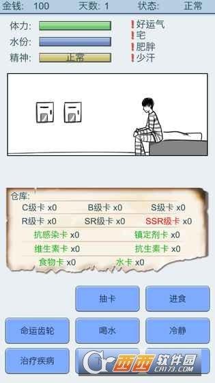 这也是生存手游,抽卡的同时记得先让自己活下去,因为你的食物,水,可都是抽卡得来的。你还会生病,记得及时治疗。