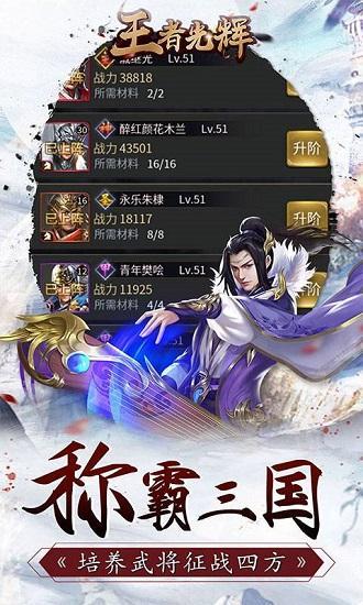 王者光辉游戏以三国为年代背景,各种三国猛将任你选择,还有更好玩的画风等你一起参和哦!史诗级精品手游,将带你领会赤壁之战火烧战船的磅礴大气,体味关羽败走麦城的辛酸和无奈,更有诸多猛将随你征战沙场,炫酷战斗场面一触即发!