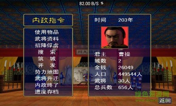 1、在内政模式中,你能搜索武将、武器、兵符、阵型等,为你的武将装备武器装备,学习各种兵种阵型。此外还能招募武将、查看情报、补充城防、进展人口、提拔武将等。