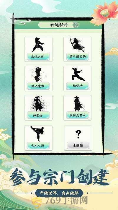 b.参与宗门创建——功法楼、武技阁、炼丹房。。等等宗门机构都需要设立,在修仙世界中收集材料,用心推进,你将会获得一个强大的修仙宗门