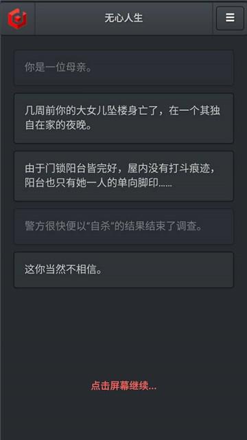 无心人生是一款可以让玩家体验到真实人生的手游,本作中主角的女儿跳楼身亡了,被判断为自杀。作为孩子的家人,你需要去寻找到关于孩子跳楼的真相。你将会从女儿身上的衣物开始进行调查,努力去发现关于事件背后的真相。游戏出色的文字功底相信会让不少朋友满意