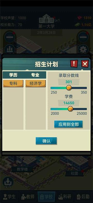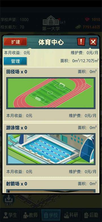 模拟经营我的大学正式版游戏中玩家需要作为校长来解锁学生的学习、生活以及多种多样的问题,在校园中处理好各种各样的时间,帮助学校逐步发展,这款游戏中将可以有很多的玩法等待玩家的体验,此外游戏中还有多种多样的建筑等待玩家的建设,玩家需要完成各种任务来解锁。