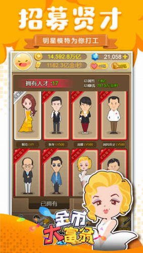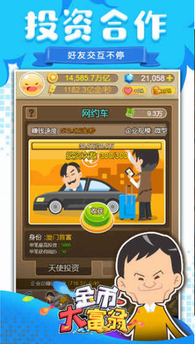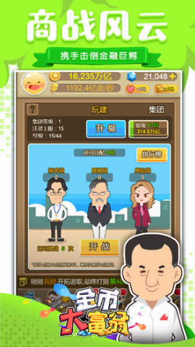 金币大富翁百度版诸位玩家将从一个城市小草根开始,通过自己的努力逐渐发展成商业大亨,简单轻松的点击操作玩法,玩家不用耗费过多的力气就能赚取丰厚的金币,和各种具有发展潜力的企业合作,自由挑选合适的投资项目,提升员工的各项技能,从而获取对应的加成,成为万人敬仰的一代首富。