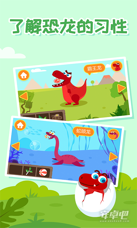 3、这款手游专注于宝宝的早教,孩子只要通过简单有意思的小手游就可以够学习到诸多关于恐龙的小知识,拓展自己的知识库,让学习不要再枯燥,提高孩子们的学习积极性,培养孩子良好的学习习惯