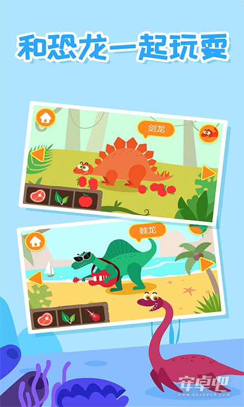 1、手游用萌趣可喜欢的画风与明艳的色彩绘制了史前时代各种类的恐龙,让宝宝可以学习恐龙有关的知识,知道恐龙的前世今生