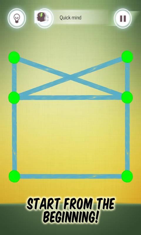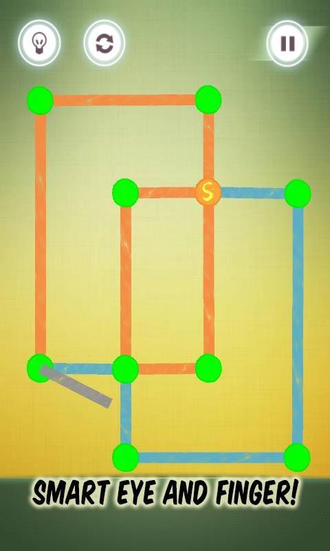 连点成线,完成图案,也许就像你看到的这么简单。但是从你手指触到屏幕的那一刻起,就不能反悔啦。你必须仔细思考下一步;或者后悔地抬起手指——你之前做的所有痕迹都会消失。接受挑战,用一笔来完成图案吧!
