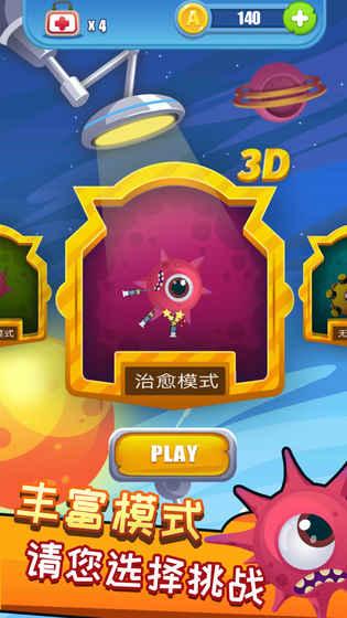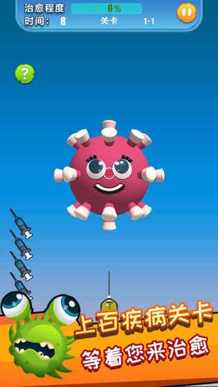 游戏画面中央放置着一枚按一定规则旋转的3D细菌模型,玩家需要避开细菌敏感区域,点击屏幕进行射击,消灭可爱的细菌,达成游戏目标。
