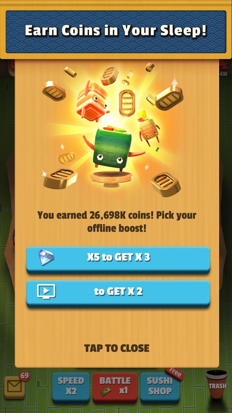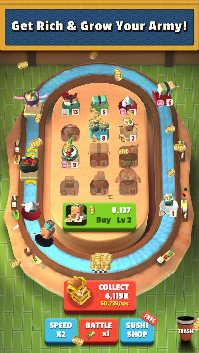 合并2个寿司以获得更高级别的寿司。因为1+1大于2,就这么简单。合成更多的寿司,并成为最耀眼的寿司大师!