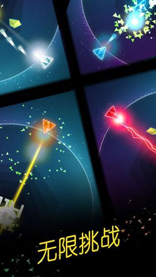 在这里你只需要控制着这架处于圆弧上的的飞机不断的攻击圆心飞出的物体即可,期间在圆弧上还会出现一系列道具和技能强化你的攻击,但随着时间的进行,中间非出的物体也会越来越多,会给你,所以怎么面对和解决才是你制胜的关键。