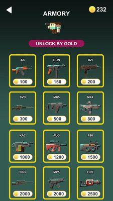 很简单,上楼梯,向坏人开枪,完成任务,你只需要瞄准好,其他都会自动进行,完成任务之后获得金币,去武器库挑选你心仪的武器,推荐散弹枪,范围广,容错率高,因为你只有一次机会,如果你没射中敌人你就会被反杀!注意哦,每一关的BOSS可以抗住两次射击!