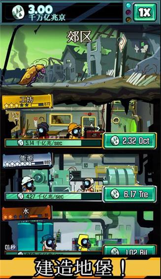 你花了数年开发出一种技术,能抵御地球表面被完全损毁。而末日幸存者们别无选择只能救助于你 — 他们的拯救者、恩人和最高领袖!点击按钮来建造你的地下避难所,然后继续点击可用豪华房舍及升级来扩展它。你的地堡越大,你就能容下越多的人,你也就能赚取更多的钱。持续点击,观察你的利润增长得更大、更离谱!