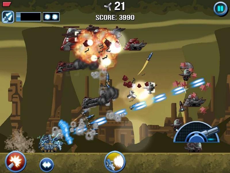 坦克的对手种类也十分的丰富,有会空投地面单位的运输机、会轰炸的攻击机、会进行自杀式爆炸的飞行机器人、还有发射地地导弹的导弹车等等。每种敌人都会有加大尺寸,越大越耐揍,进攻方式也更强,掉落的升级道具更多,算是在无尽的冲杀中加入的 BOSS。