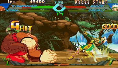 1996年CAPCOM退出了第一款乱斗系列游戏《X-MAN对街霸》,游戏中X-MAN与街霸双方个登场8位角色以两人搭档形式进行战斗。高跳跃、挑空连续技与双人必杀令这个游戏充满了喧哗气息