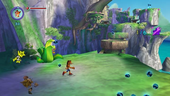 这里有个很搞笑的假宝箱,突然间会长眼睛变成一个长满刺的旋转攻击物体。千万别攻击它,因为自己会掉血而它却毫发未损。跳过一系列障碍道路后,能看到一个图腾。按圆圈键后就能记录游戏进度了。存完进度后,一路网上走上了一个平台。你会看到许多红色的箱子。是定时炸弹!不要打爆它,走进以后会拉响警报。响三次就炸了。走远点就行了。附近又会有一个螺旋型的石阶,踩在上面摇杆转一圈再按三次方块键,又会蹦出来许多宝石(原来收集宝石还有那么多稀奇古怪的方法)。踩着蹦床,按住方块不放可以跳的更高。跳上高墙以后又进入了下个地图。