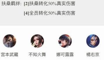 4扶桑羁绊成型后每个英雄棋子都可以转化50%的真实伤害,最终成型之后让我们5法师的大招伤害不输7法的伤害,同是对一些肉羁绊阵容又有克制效果。
