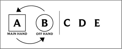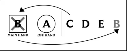 因为厄斐琉斯可以在主副手武器之间进行切换,这就导致他的武器队列顺序在游戏过程中经常改变——取决于他首先使用哪件武器。