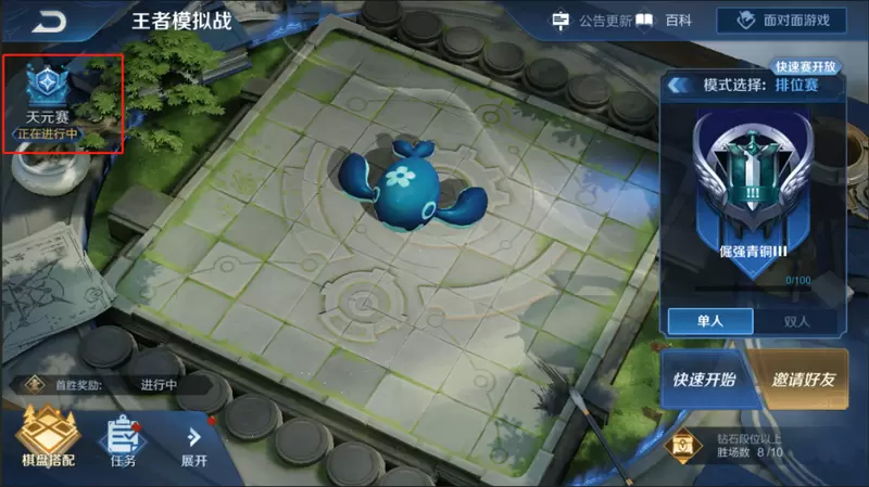 有点类似排位中的巅峰赛,王者模拟战的天元赛每天12点~24点限时开放,但对段位没有要求,而是分为青铜赛、黄金赛、钻石赛、王者赛4个等级模式,使用天元币或其他代币进入对应的模式,根据最终排名赢得天元币奖励。