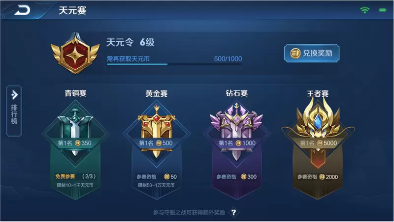 最后根据排名结算天元币,结算时数量为正,则会在增加对应的天元令等级。每天完成任务可以获得一次免费参加天元赛的机会,天元令的等级决定你能参加的比赛是黄金、钻石还是王者,而天元币也能兑换相应的奖励。