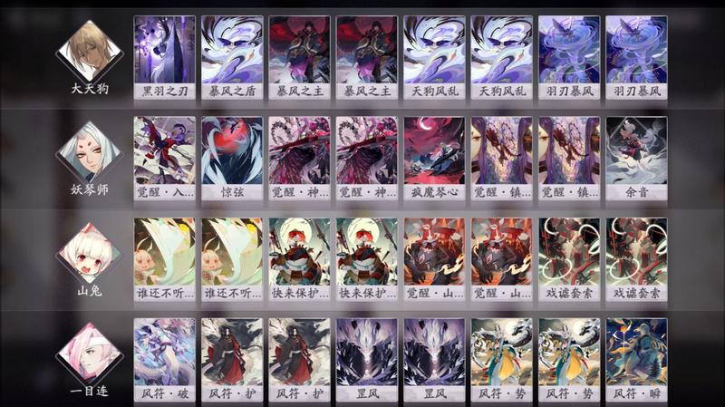 后期(3勾玉):这个阶段玩家要清楚有几种可以连续发动羽刃风暴的方法。妖琴师的惊弦、觉醒神乐歌、余音、和山兔的运势都是可以缩减倒计时的办法。所以在这套卡组中妖琴师的二勾玉神乐歌更为重要。无论如何切换妖琴师的觉醒状态,最后应该落在神乐歌上面来,这样才好在后期持续给对方施加压力。如果大天狗能顺利释放出2次法术,通常至少可以击杀2-3名式神,这个时候不要贪心,看准对方式神即将复活的时机,使用风魔琴心重置他们的复活倒计时,就可以实现以多打少,前期落后的场面在此时都可以被追回,甚至反超。