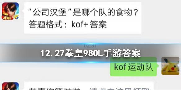 拳皇98终极之战ol微信12月27日每日一题答案 公司汉堡是哪个队的食物
