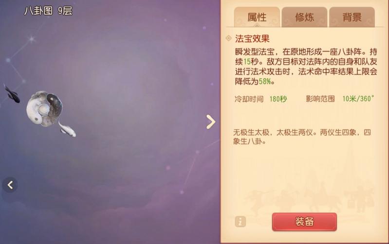 一、【八卦图】:布下八卦图之后,使10米范围内敌方的法术命中率降低。