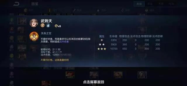 现在的武则天眩晕效果全部为2秒,但目标个数和伤害就不一样了。只要升级到2星,她大招可打击的目标就会变成6个,并且伤害也大幅增加。对于5费英雄就不必奢望3星了,所以,2星的武则天已经是非常强的了。
