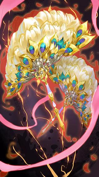 时洪荒乱象,毒龙盘踞,九州涂炭,迦楼罗尽食毒兽,还四海清平。然其食毒日久,毒终发,坠陨金轮山,浴火而亡。其羽散落,心为琉璃玉,色靛紫。匠人采金羽,集宝珠,成迦楼金羽扇。