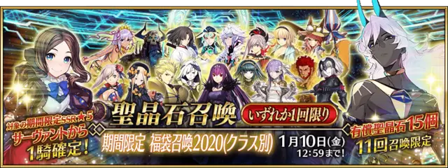 使用15个付费圣晶石进行召唤。使用免费圣晶石无法召唤。必定获得1骑期间限定★5(SSR)从者、1张★4(SR)以上的卡牌、1骑★3(R)以上的从者!