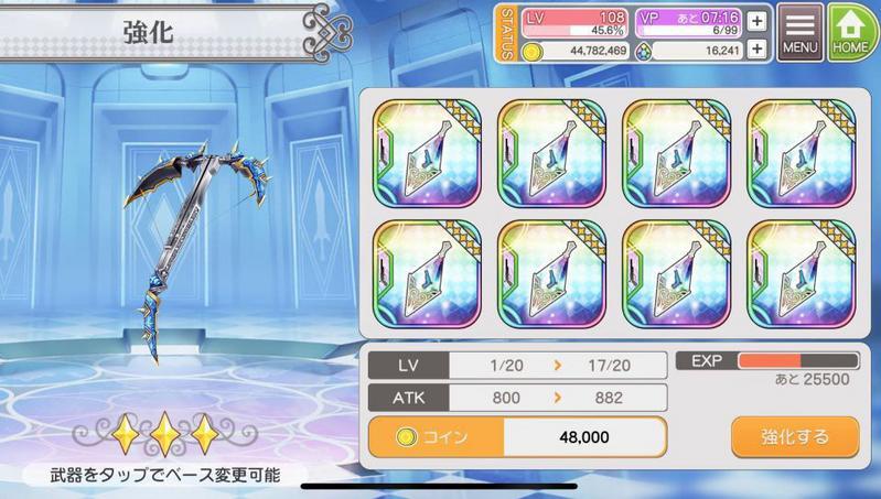 武器强化和卡片强化大致相同,都需要花费金钱和升级材料,只不过武器采用的是另一种升级材料,而且花费的金钱和所需经验远大于卡片升级。此外,武器强化同样拥有大成功设定,武器升级遇到大成功就赚大了。0阶的3星武器只能升级到20级,每突破一次等级上限+5,4阶3星武器等级上限为40。