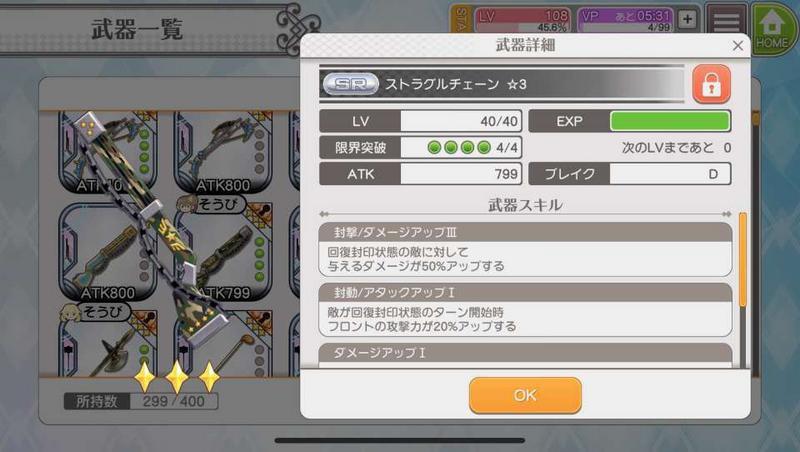在武器的突破界面中可以预览该武器可能会获得的技能,就算是同种武器,能够获得的技能也是随机的。一把3星武器在制作完成时除了固定的基础技能之外还会随机获得一个技能,回封枪的基础技能就是“敌方回复封印时受到伤害增加50%”,而“敌方回复封印的回合开始时我方前排攻击力增加20%”是它的随机技能。