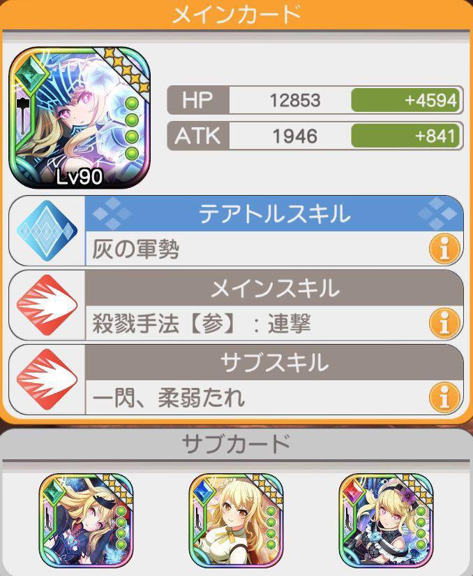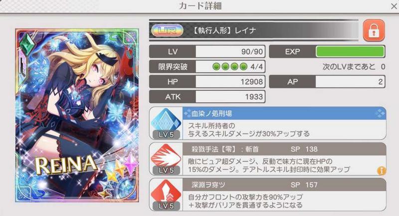 第二个技能俗称小技能,这也是决定了同系列卡片间每个角色的优劣的关键因素,一张卡片好不好用要看大技能,但具体选哪个角色上阵还得看小技能,每个人的小技能都是不同的,下图中Reina的小技能为让前排的攻击力+90%并且附带穿透,而Yuki的小技能就是增加Heart槽了。