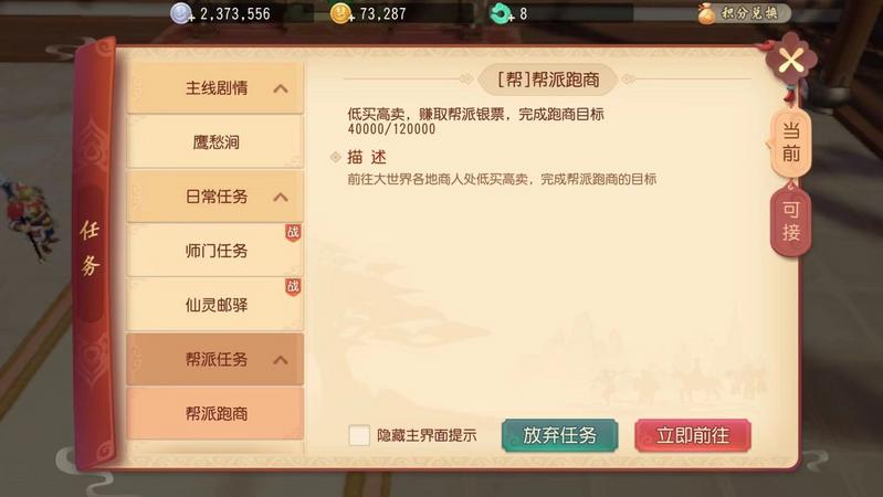 接取任务的时候可以获得价值4万的帮派银票,这4万就是我们的起始资金。