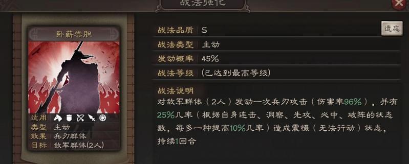 瞬发群体控制兵刃伤害战法,是兵刃战法中唯一可以和【横扫千军】相提并论的顶级战法。【卧薪尝胆】在伤害方面虽然不如【横扫千军】,但胜在控制更强,尤其是孙权装备上更是如虎添翼,因为孙权是唯一一个能使震慑概率达到75%的武将。