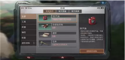 幸存者们可以在配方中制作92汽油,保证摩托车充足的能源供应。